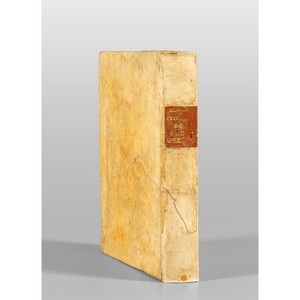 Legatura in piena pergamena rigida coeva, dorso a sei nervi ornato in oro, tassello in marocchino marone, tagli spruzzati in rosso. Piccola mancanza al dorso. Interno freschissimo, salvo per una piccola gora angolare alle prime carte.