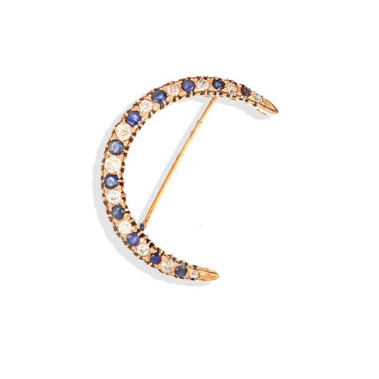 Spilla in oro rosso a demì lune con zaffiri e diamanti di taglio antico Misura 5 cm. Peso 9.5 g.