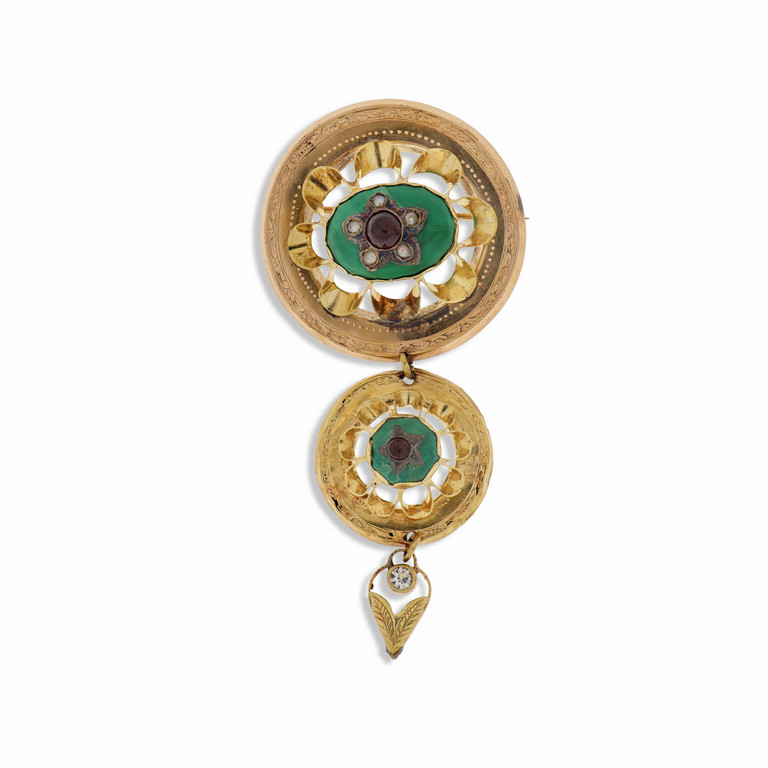 Spilla a doppio tondo con due pietre verdi centrali e e altre piccole pietre a decorare. Misure 7 x 3,5 cm. Peso 13,6 g.