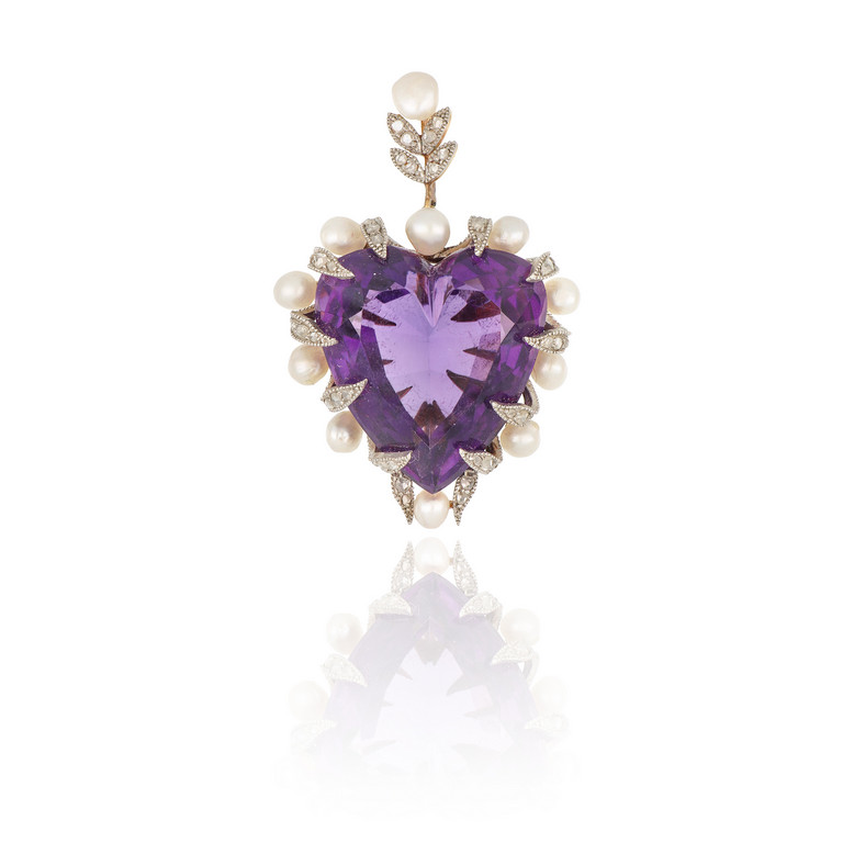 Ciondolo vittoriano di bella manifattura con grande ametista a cuore, contornato da piccole perline e diamanti. Dimensione 4,5 x 3 cm. Peso 15,76 g.