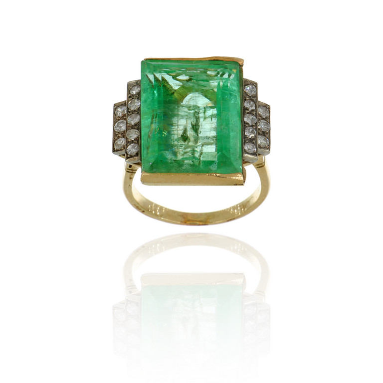 Anello anni'40 in oro giallo, al centro un grande smeraldo taglio rettangolare di stimati ct.10,0, ai lati su due livelli differenti due righe di diamanti taglio 8/8. Misura n. 10. Peso 8,8 g.