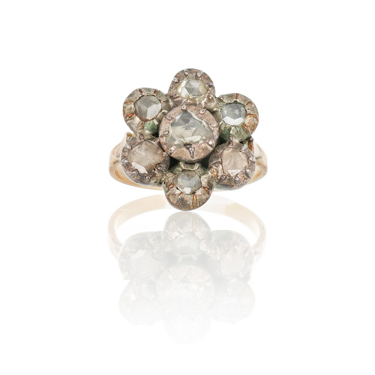 Antico anello a rosa, realizzato in oro e argento, i diamanti taglio rosetta sono incassati a notte alla maniera dei tempi. Misura n. 19. Peso 7,0 g.