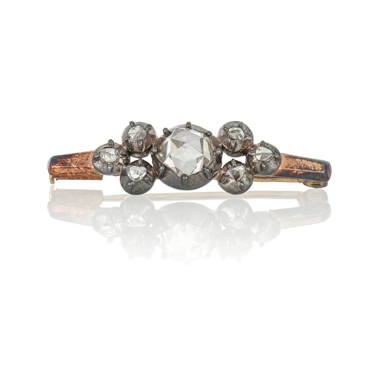 Piccola spilla in oro rosso e argento, antica manifattura decorata al centro con un diamante taglio rosa di ct. 0,30 ca e altri piu' piccoli ai lati. Lunghezza 3 cm. Peso 2,3 g.