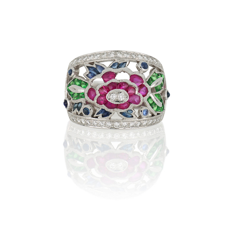 Finissimo anello in oro bianco con lavorazione a traforo impreziosita da gemme tagliate buff top e sagomate per formare un fiore. Misura 15. Peso 8,59 g.