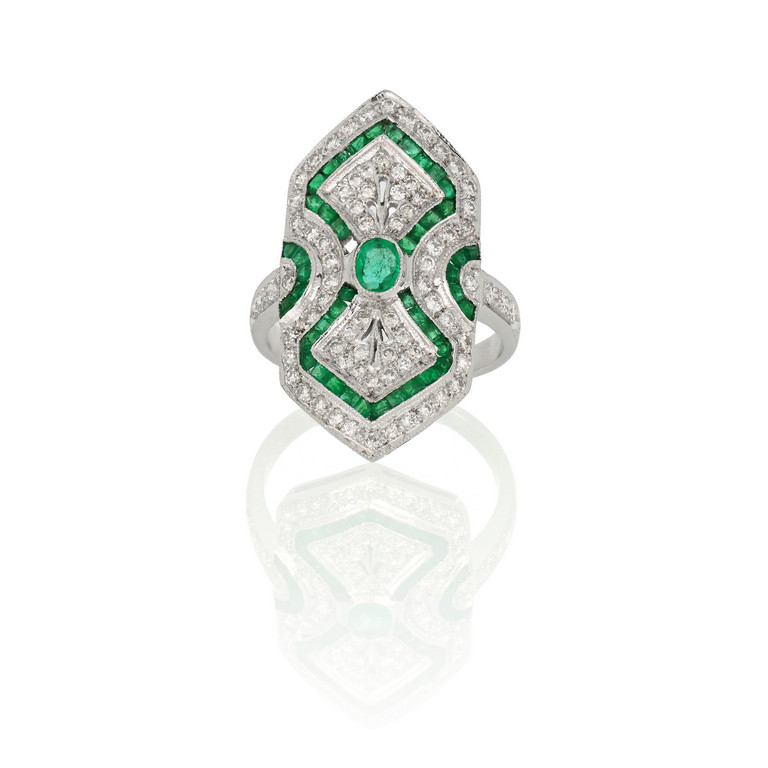 Anello in oro bianco in stile decò con delicata geometria esagonale a cornice con piccoli smeraldi (uno mancante) e pavè di diamanti. Misura 13. Peso 6.30 g.
