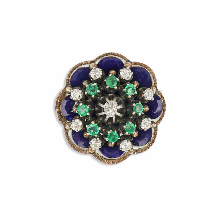 Spilla rosone con smalti blu e decorata da diamanti di taglio antico di ct. 1,80 ca. e smeraldi di taglio rotondo. Diam. 3 cm. Peso 13,2 g.
