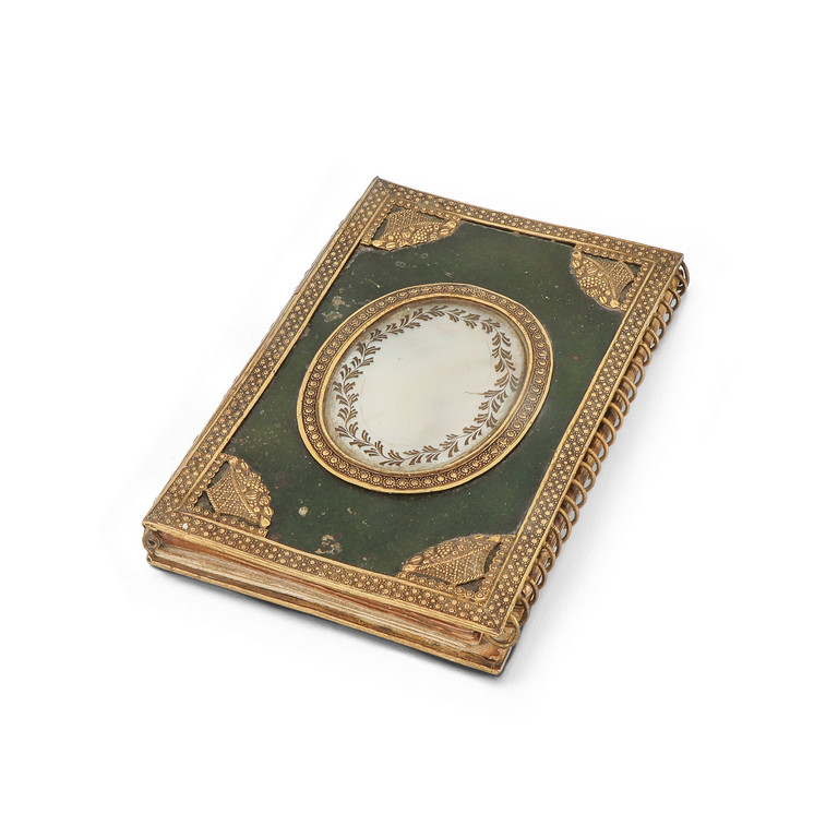 Libricino souvenir francese di fine 800 con struttura in ottone e madreperla, rilegato a spirale la cui chiusura utilizza una piccola matita in ottone come serraggio.