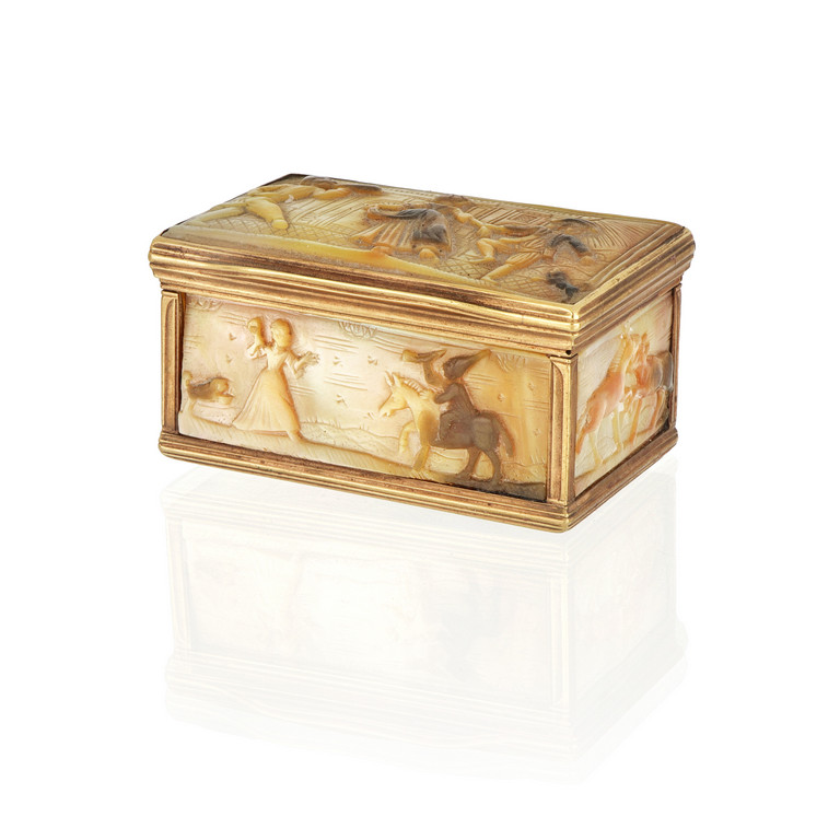 Tabacchiera del XIX in madreperla finemente intagliata con montatura in ottone dorato. Le scene figurate rappresentano momenti della Commedia dell'arte, e scene di caccia. Dimensioni 6 x 4 x 3 cm Peso 84.9 g.