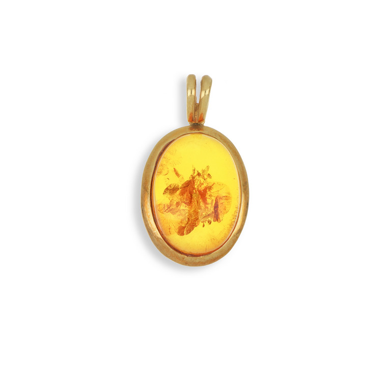 Ciondolo in oro giallo con cabochon di ambra mielata. Dimensioni 3 x 1,5 cm. Peso 4,2 g.
