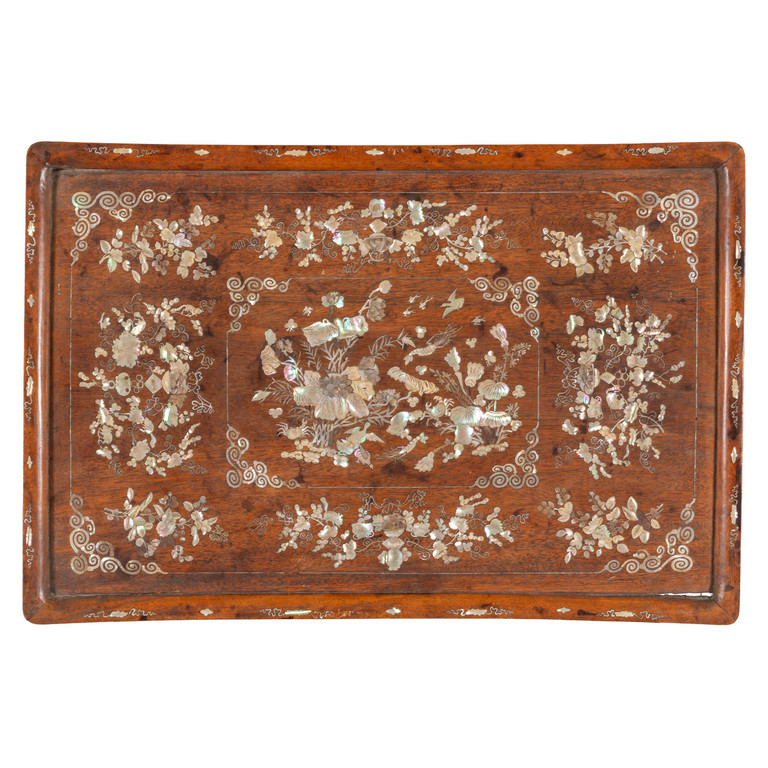 Vassoio in legno intarsiato in madreperla, sec.XIX