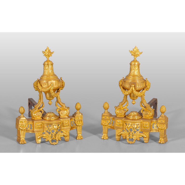 Coppia di alari in bronzo dorato, fine sec.XVIII