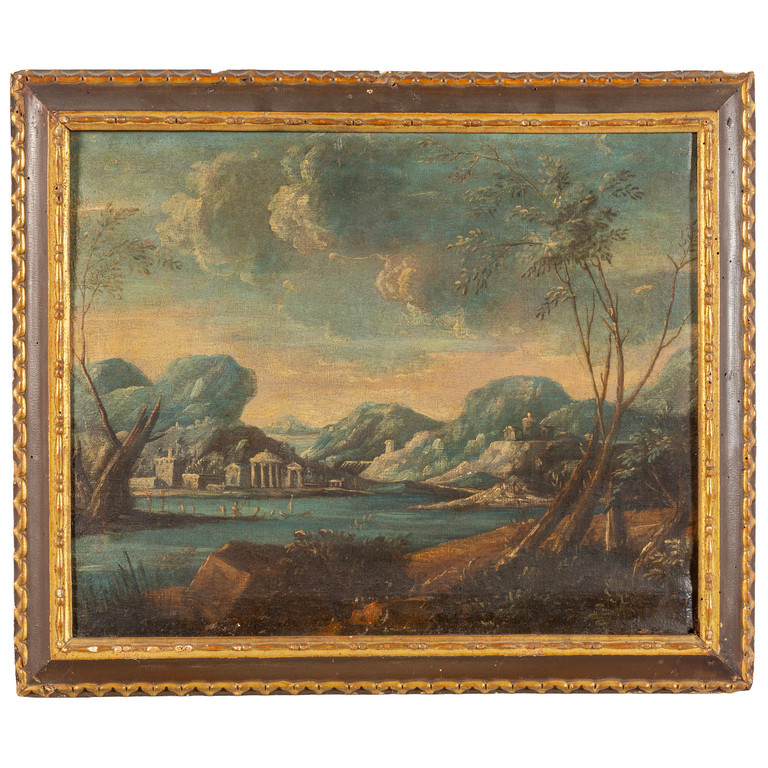 Scuola cremonese sec.XVIII 'Paesaggio lacustre' olio, cornice antica