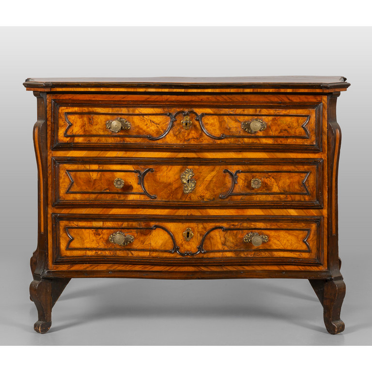 Piccolo comò Luigi XIV a tre cassetti lastronato in noce e radica, Lombardia sec.XVIII