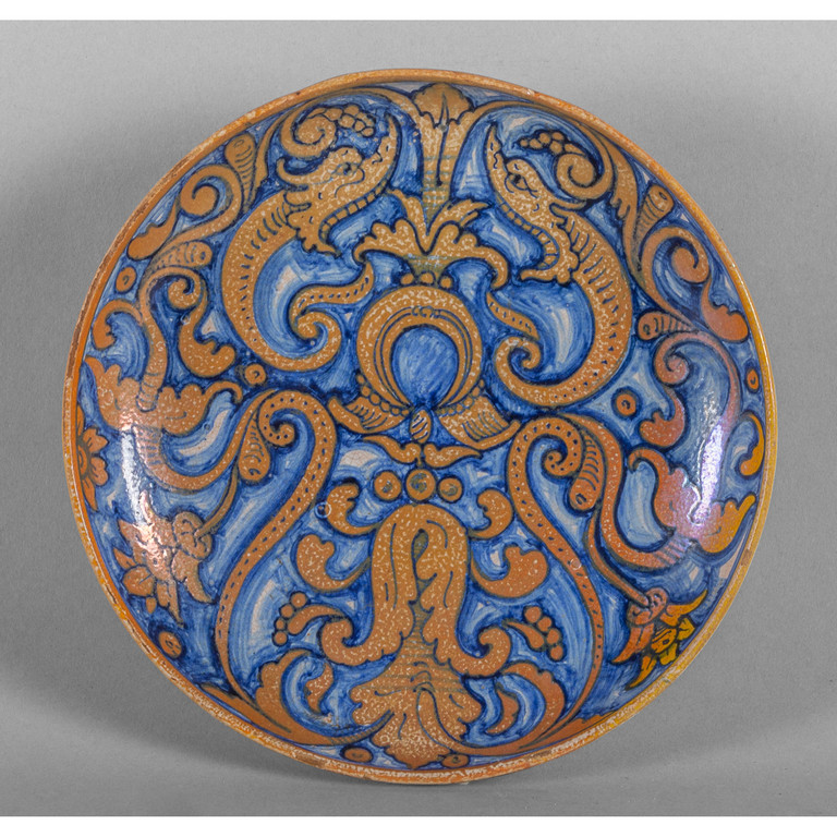 Piatto in maiolica a lustro color rubino decorato con scene di animali su fondo blu, Casteldurante sec.XIX