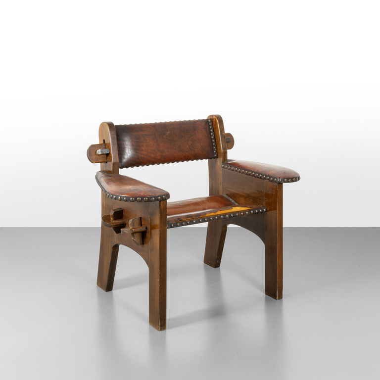 Legno di noce, imbottiture rivestite in pelle (strappi).