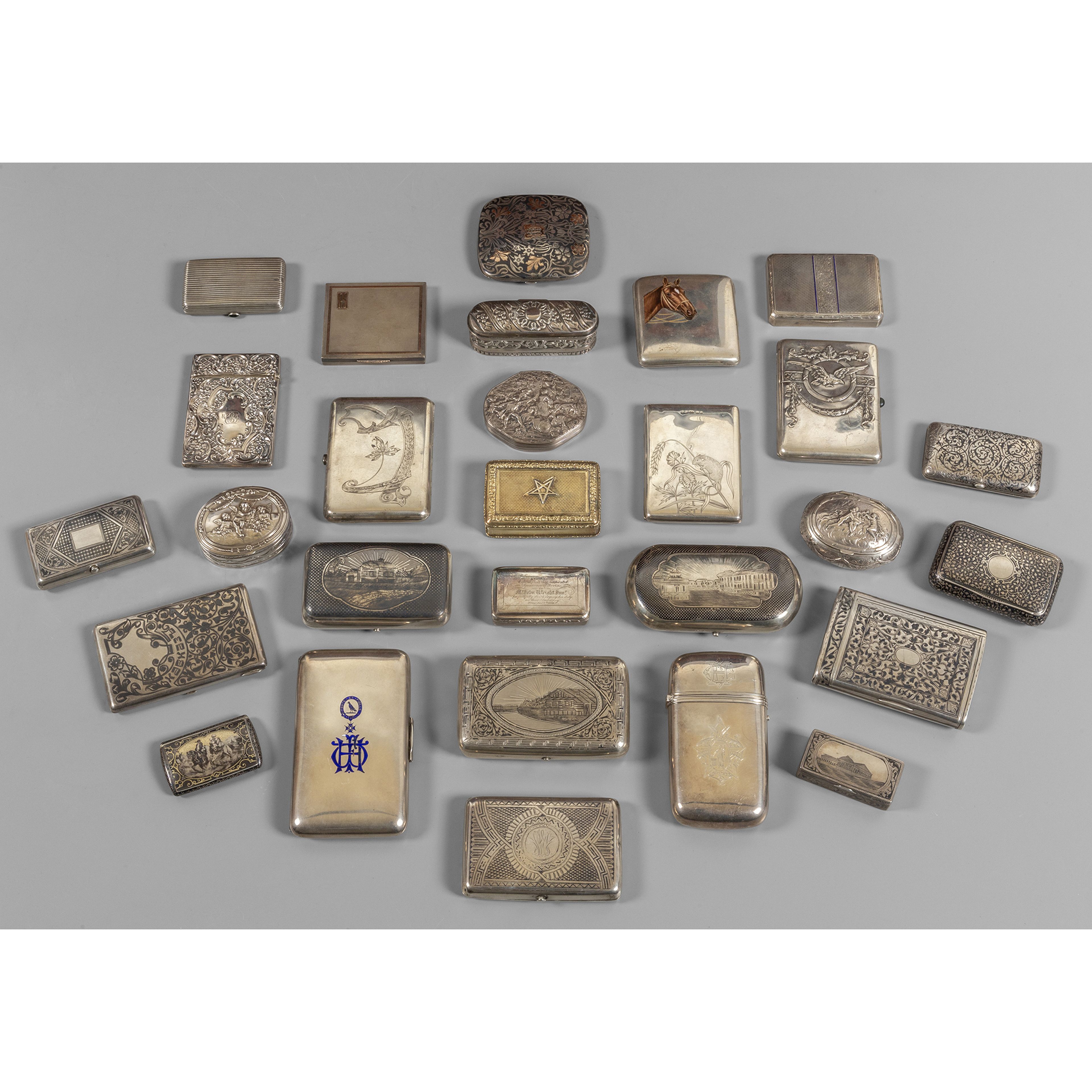 Collezione di 28 scatolette in argento di varie forme e misure, punzoni Russia, Portogallo ed Inghilterra, sec.XIX/XX