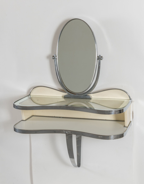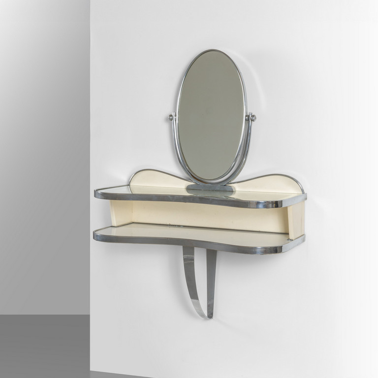 Legno laccato, ottone cromato, vetro opalino bianco, cristallo parzialmente argentato, cristallo argentato.