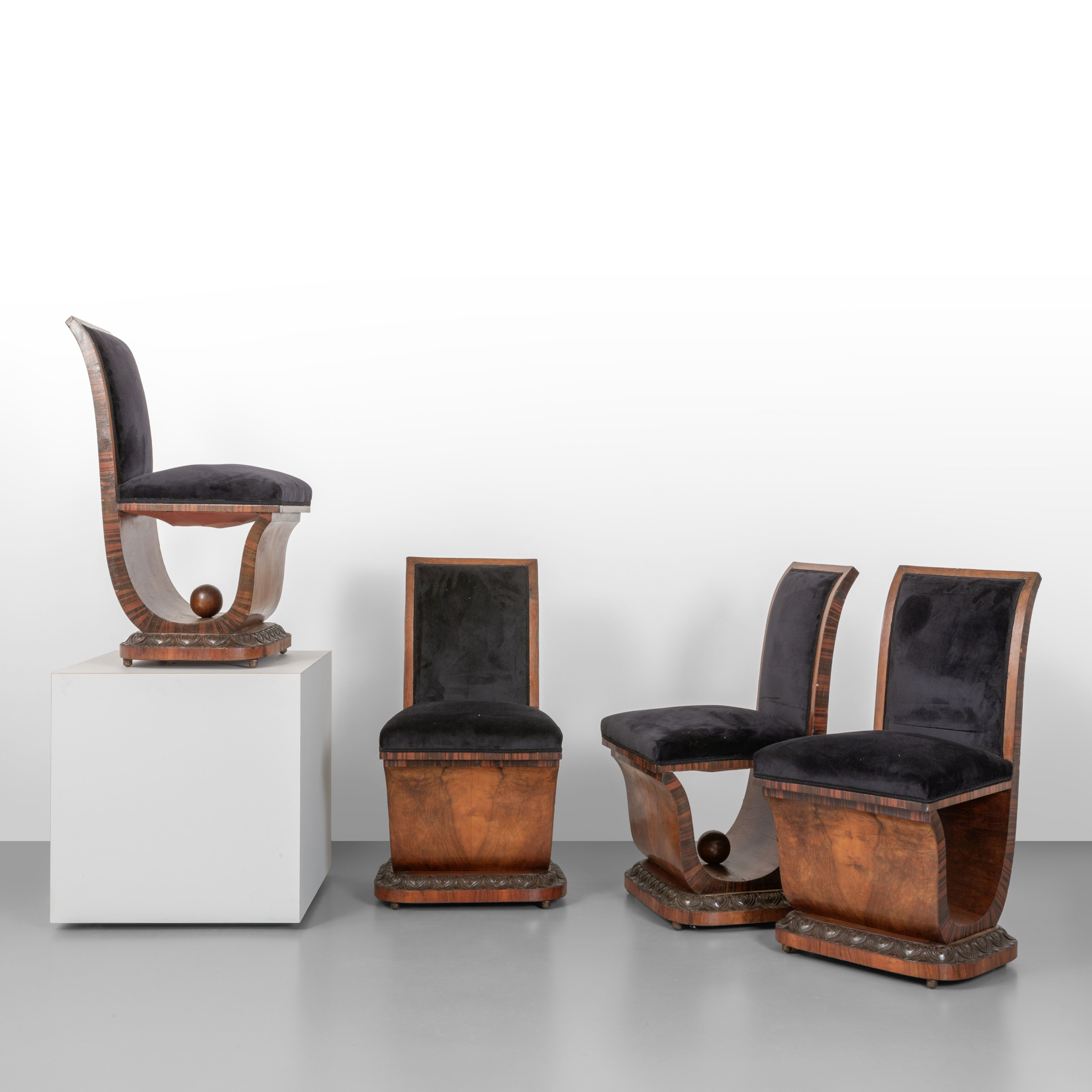 Walnut root, wood worked with floral decorations, velvet upholstery.