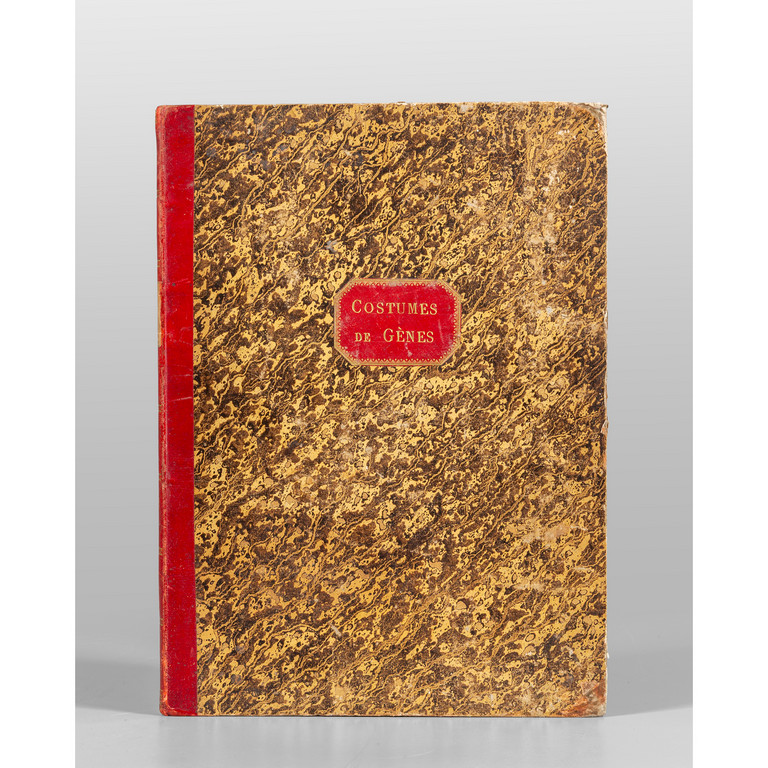 Legatura in mezzo marocchino rubino a dorso liscio. Fioriture sensibili in una sola delle 16 litografie; un piccolo strappo restaurato al margine di un'altra tavola.
