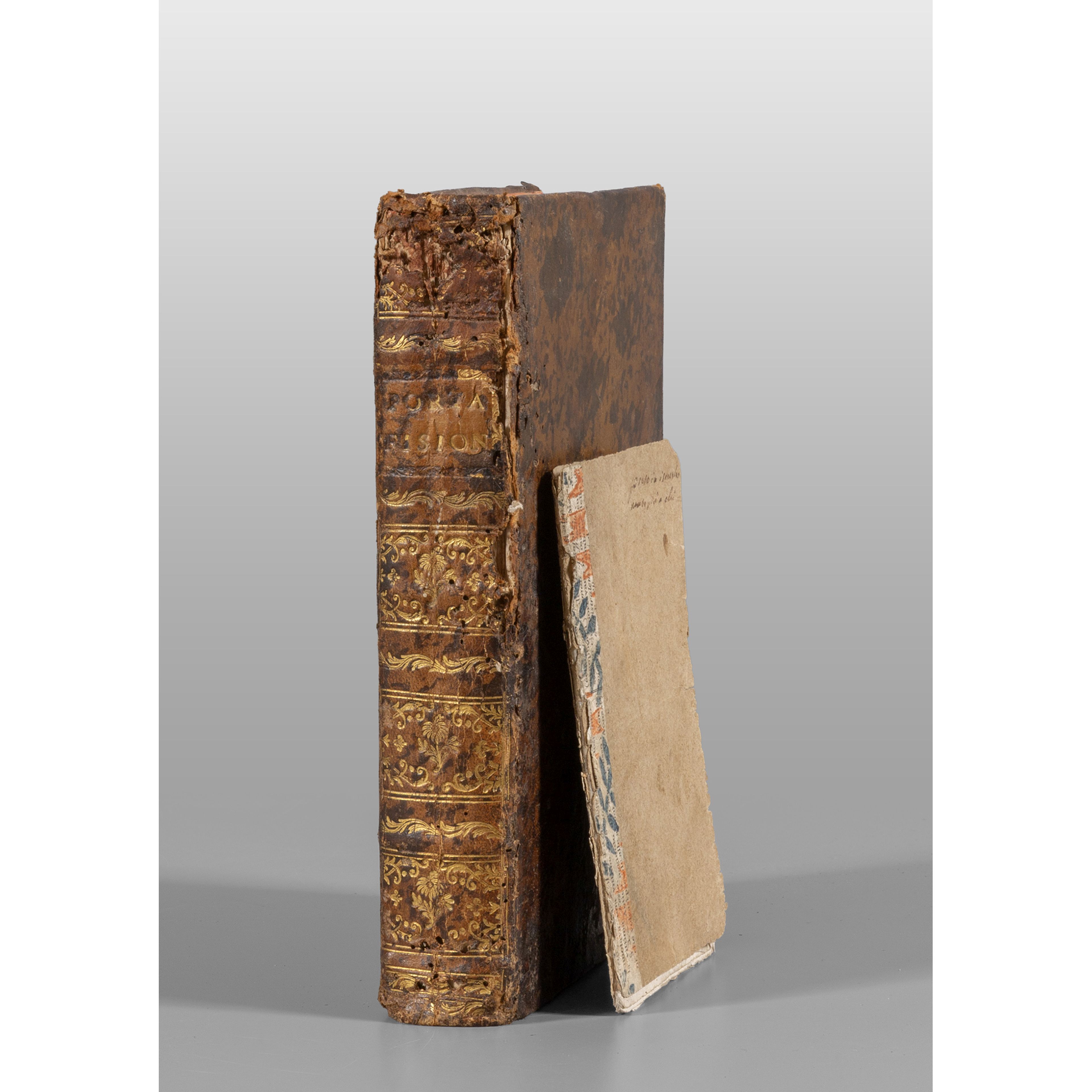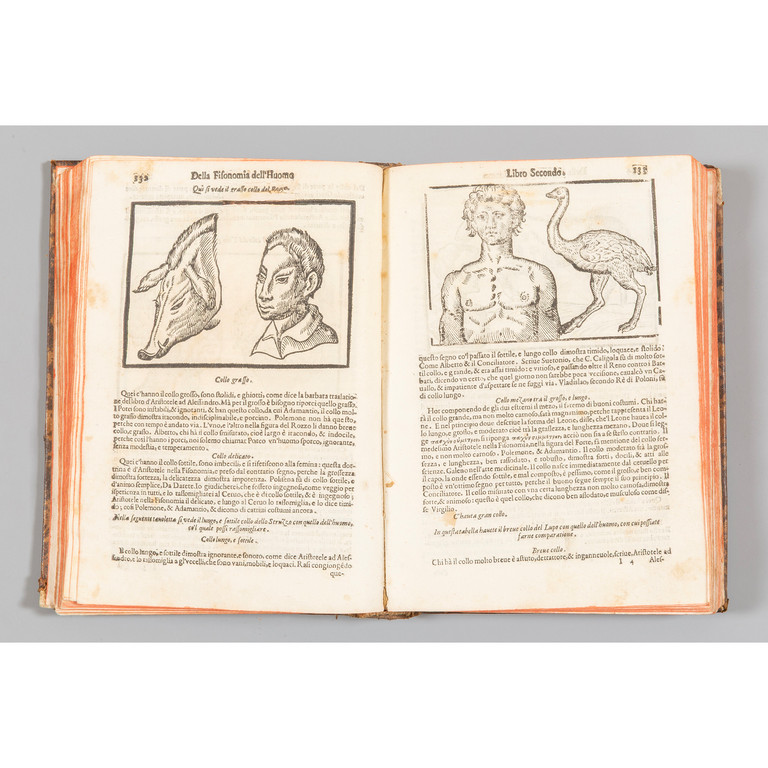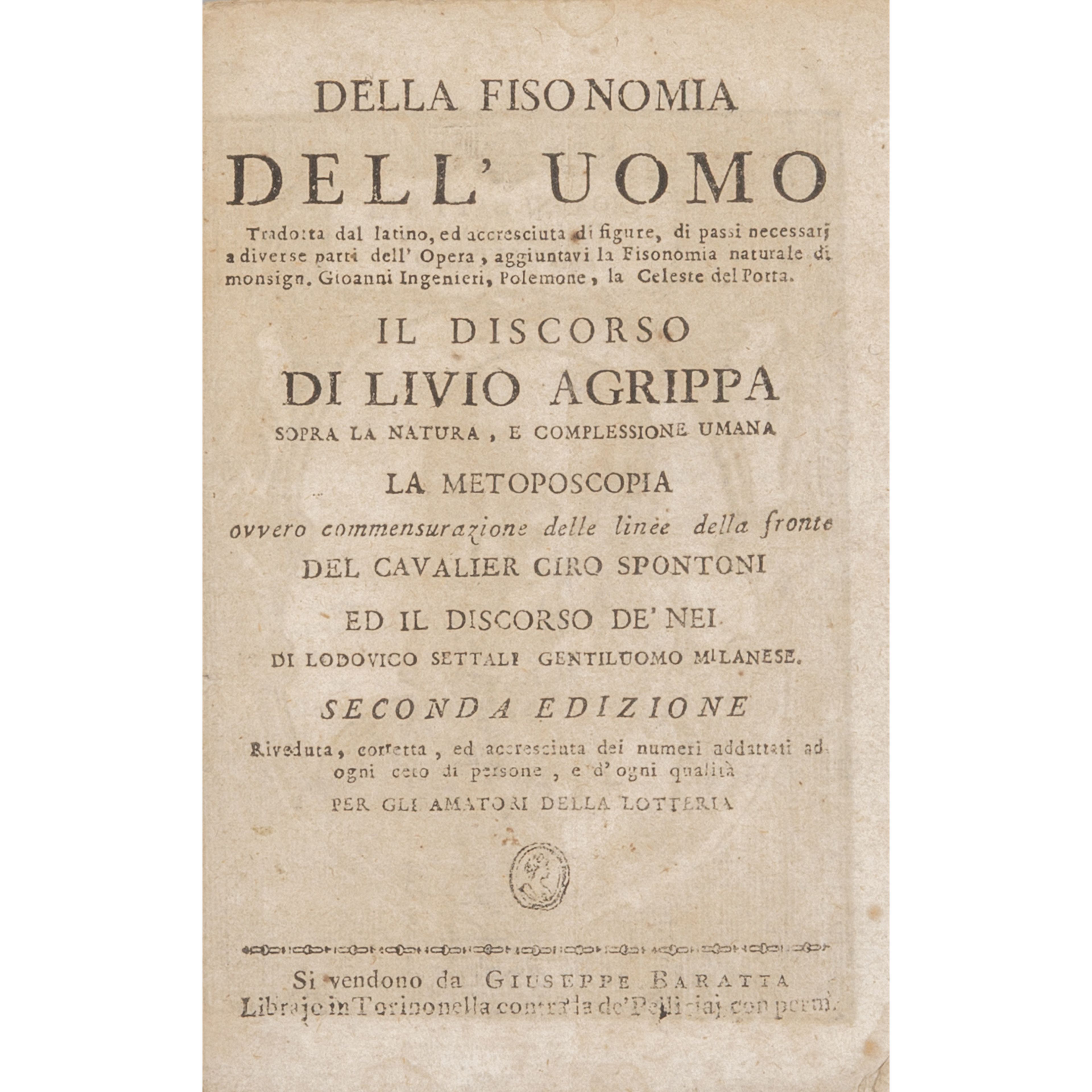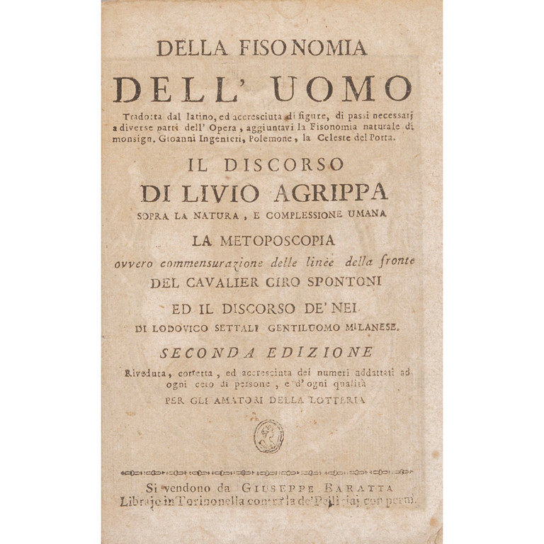 Legatura in piena bazzana settecentesca (lavoro di tarlo al dorso); a cassoni ornato in oro. Cerniera anteriore lenta. Margine di testa corto; fioriture marginali e ossidazioni alle ultime carte. Si unisce Della fisionomia dell'uomo, pamphlet pubblicitario settecentesco di 32 pagine pubblicato in Torino libraio Giuseppe Baratta (manca il bifolio pp. 29-30).