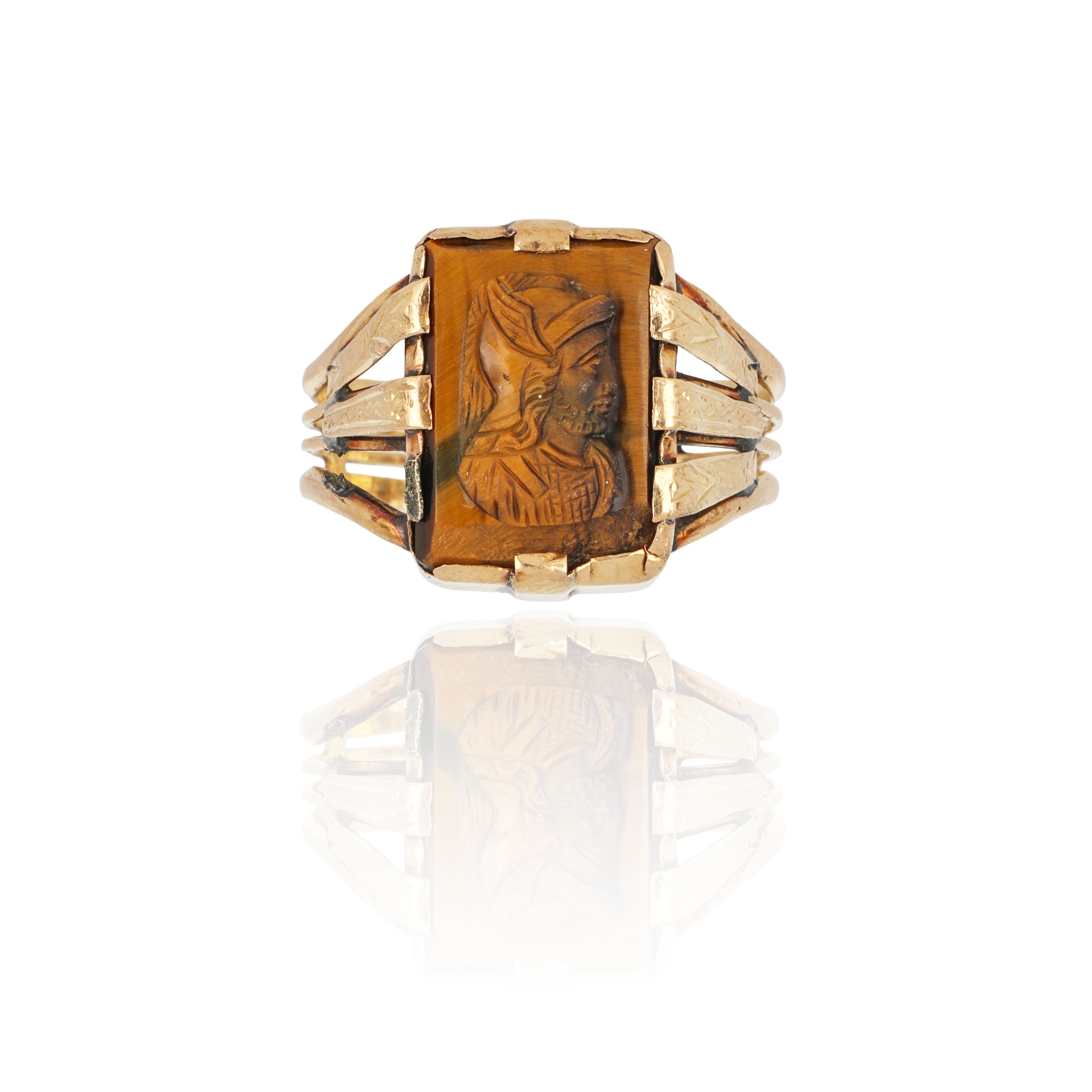 Anello in oro rosso con testa di condottiero incisa in altorilievo su quarzo occhio di tigre.
