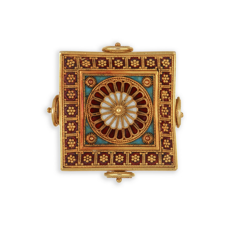 Spilla di forma quadrata in oro giallo, decori a cassetto con filigrana e fini smalti policromi, lavorazione alla maniera di 'Castellani', zecchinatura 24k.