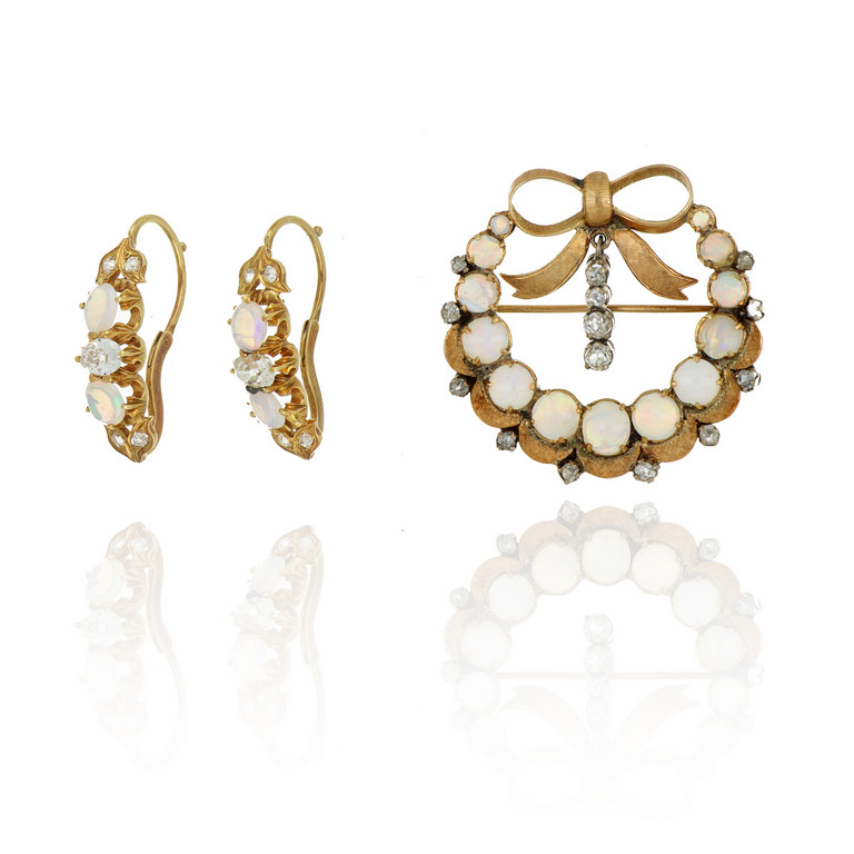 Demi parure composta da orecchini a monachella in oro con opali e diamanti di taglio vecchio e spilla a mezza luna con opali a scalare e diamanti.
