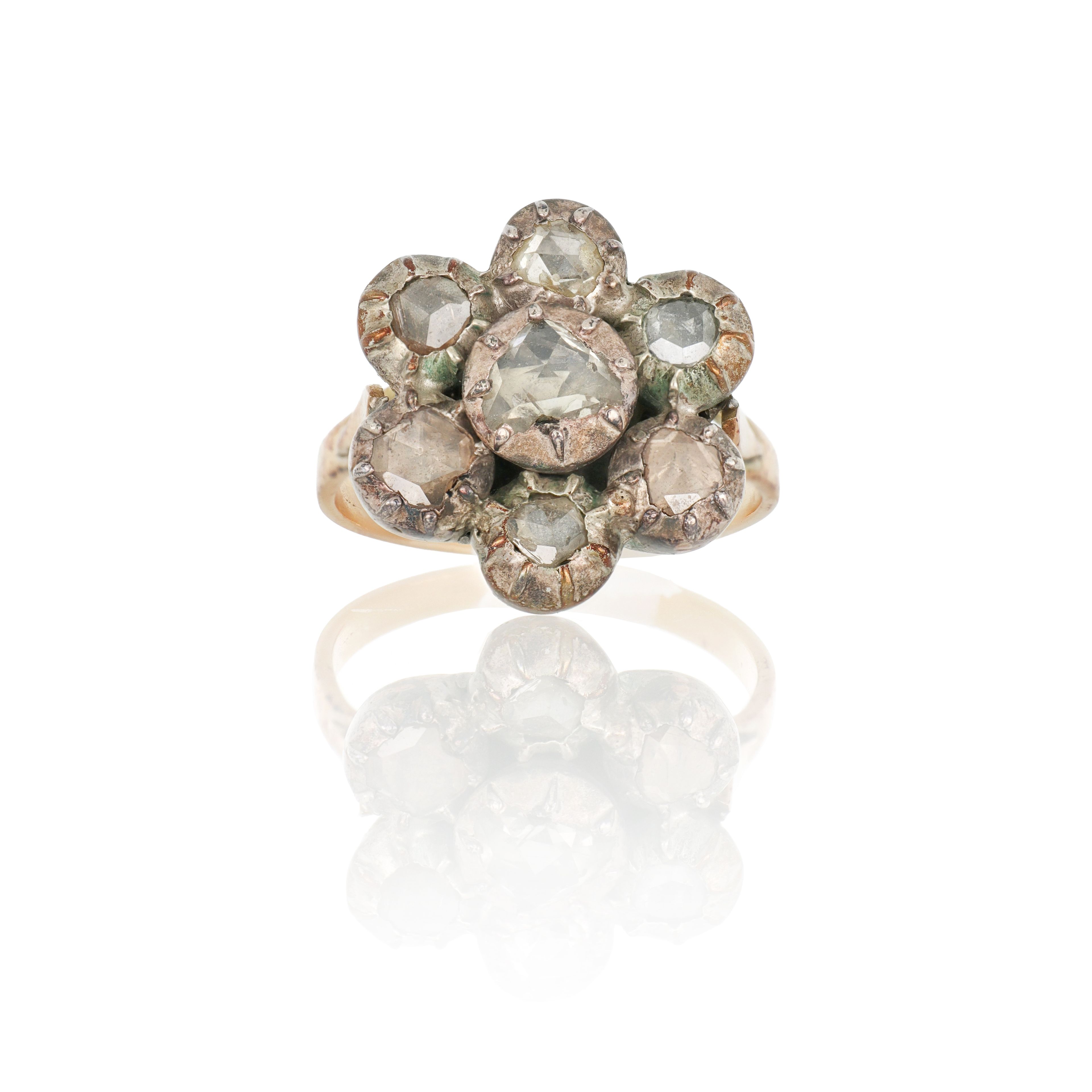 Antico anello a rosa, realizzato in oro e argento, i diamanti taglio rosetta sono incassati a notte alla maniera dei tempi.