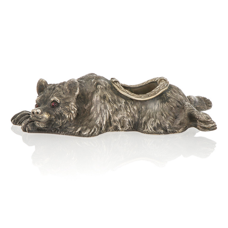 FABERGE - Orso scultoreo con funzione di calamaio in argento brunito, bordure incise a bulino ed impreziosite da cartiglio con piccoli diamanti (alcuni mancanti), occhi di granato cabochon. Firmato e punzonato Fabergè in cirillico e aquila imperiale. Punzone dell'argentiere A.N ANDERS NEVALEINEN (San Pietroburgo 1908-1917)