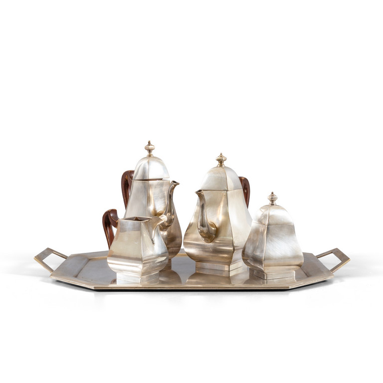 Servizio da the anni 50 in argento 800, in stile geometrico e modernista, caratterizzato da corpi inclinati e superfici piane. Superficie satinata opaca, completo di vassoio ottagonale, teiera, caffettiera, lattiera e zuccheriera.