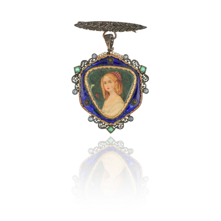 Spilla da cappotto con miniatura, realizzata in oro giallo e argento, decorata con smalti e piccole perle, al centro un ritratto di forma triangolare.