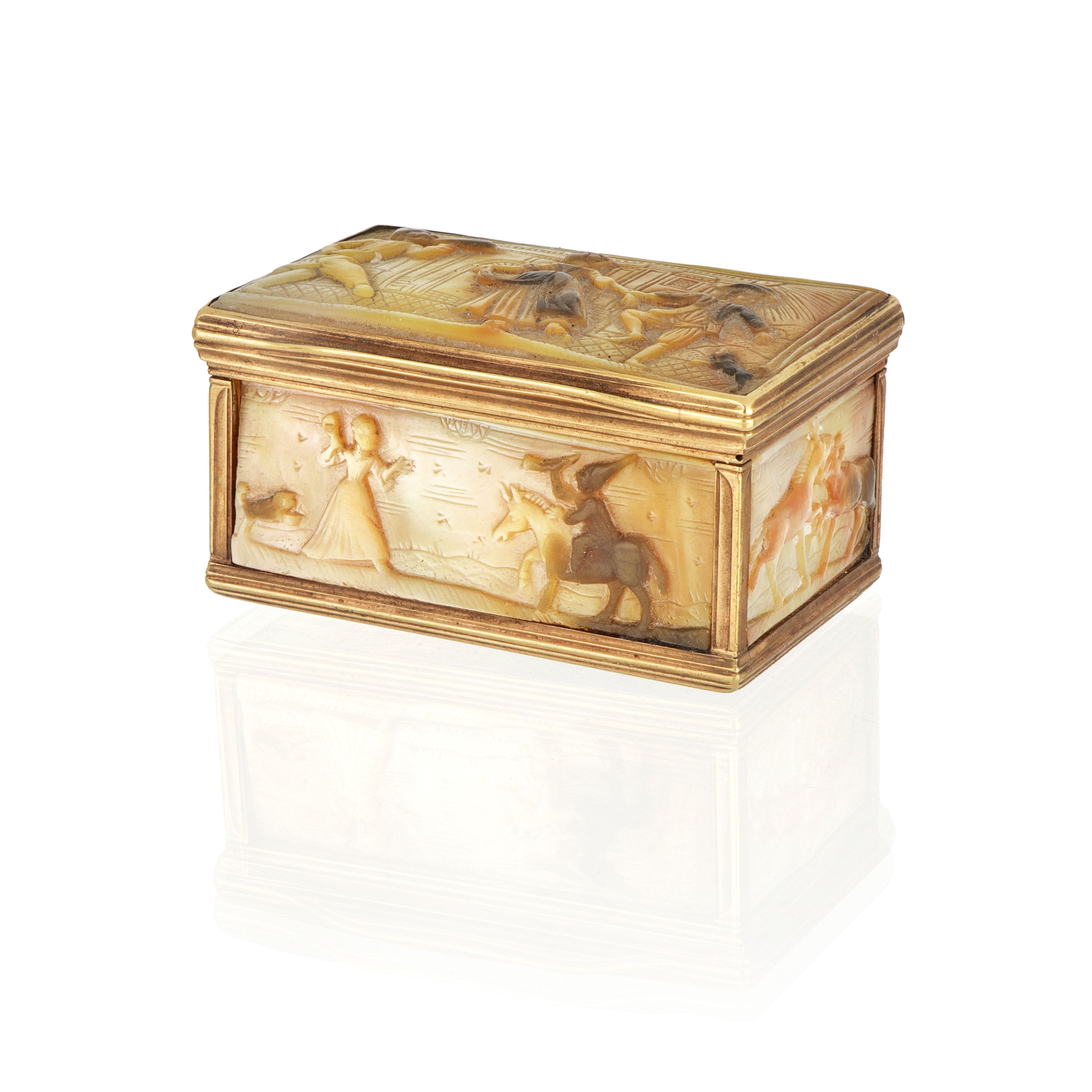 Tabacchiera del XIX in madreperla finemente intagliata con montatura in ottone dorato. Le scene figurate rappresentano momenti della Commedia dell'arte, e scene di caccia.