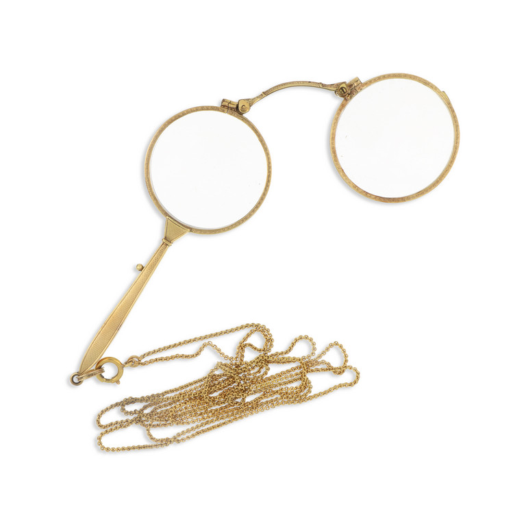 Lorgnette in oro giallo con meccanismo a scatto, con funzione di singola lente e occhiale, completa di catenella in oro.