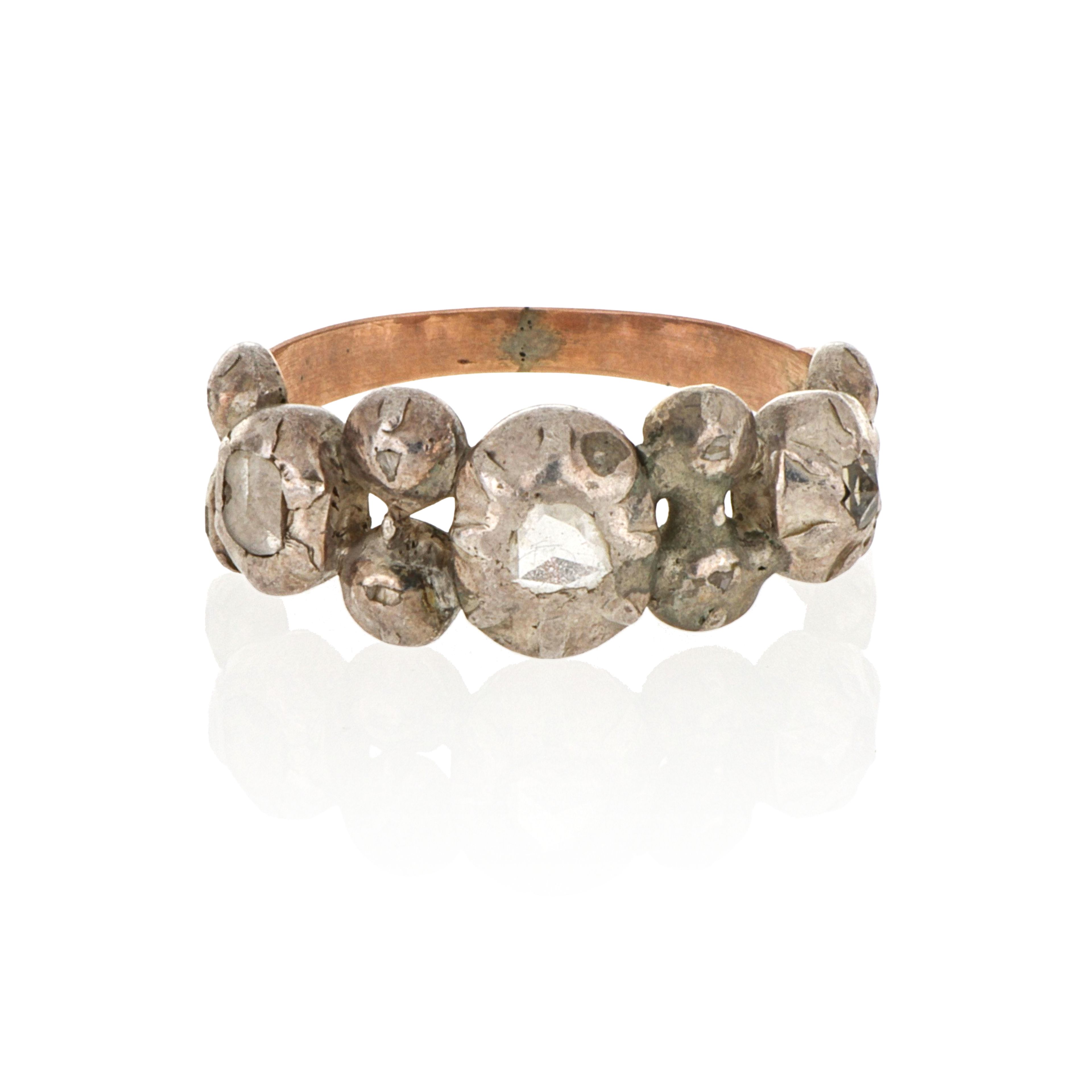 Antico anello settecentesco in argento e oro e piccoli diamanti a rosa.