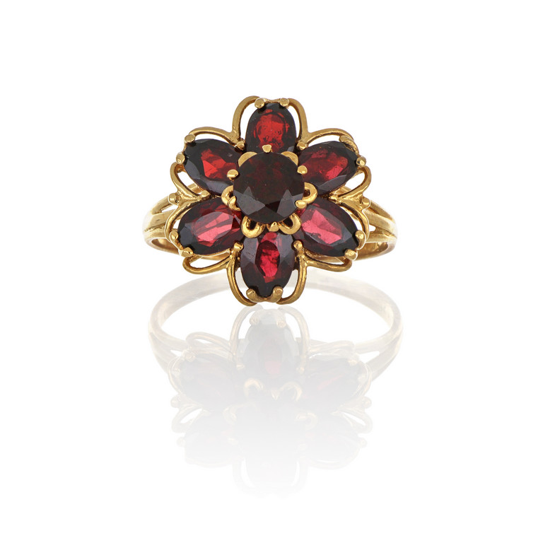 Anello in oro giallo con granati taglio ovale e rotondo.