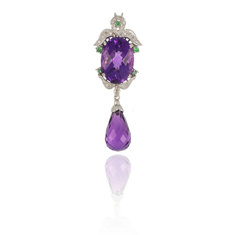 Ciondolo in oro bianco, due ametiste taglio briolet si snodano sostenute da un decoro a volute con piccoli diamanti e peridoti.