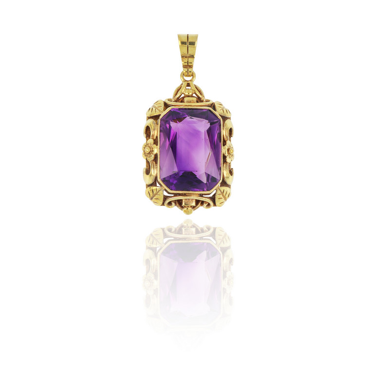 Ciondolo in oro giallo ossidato, un quarzo ametista taglio rettangolare, dal colore intenso è incastonato in questo gioiello con incisioni floreali.