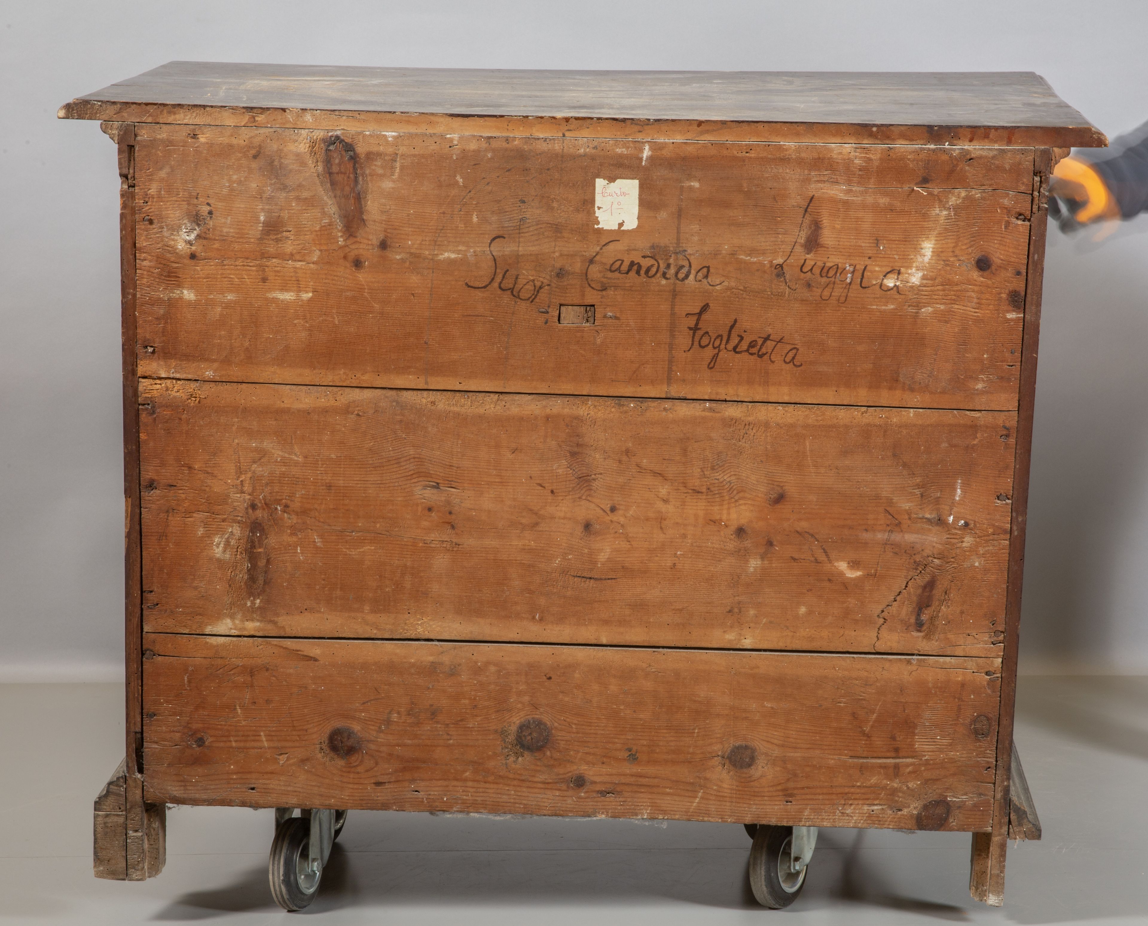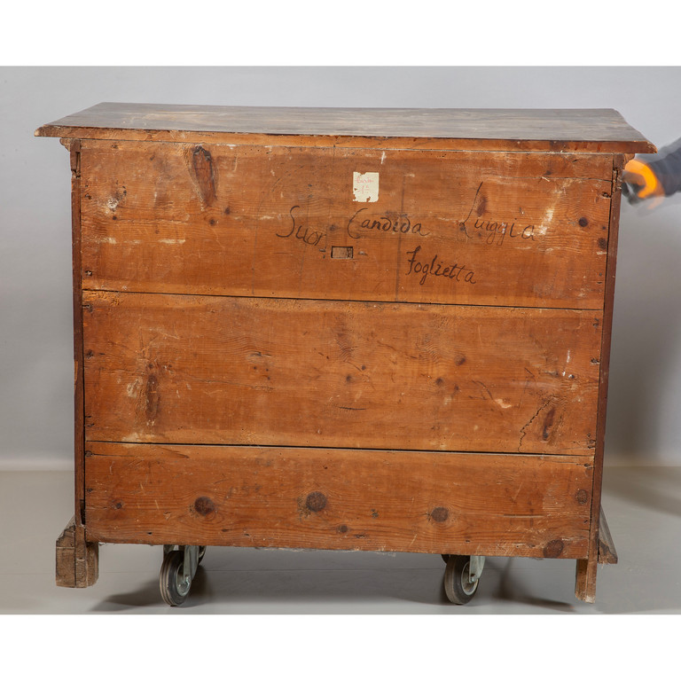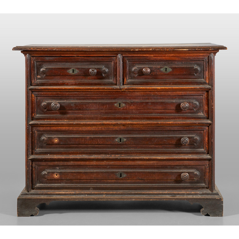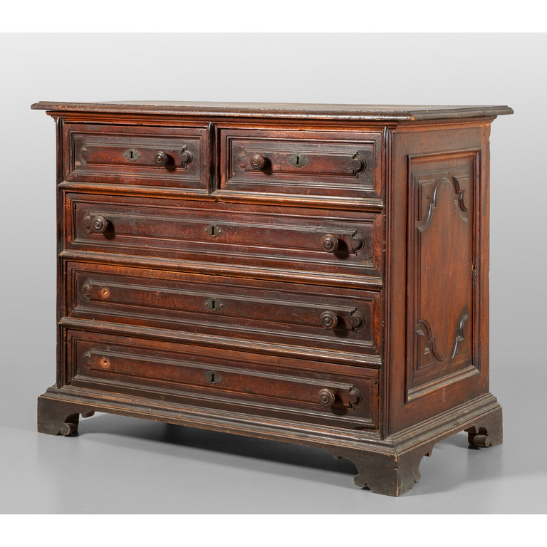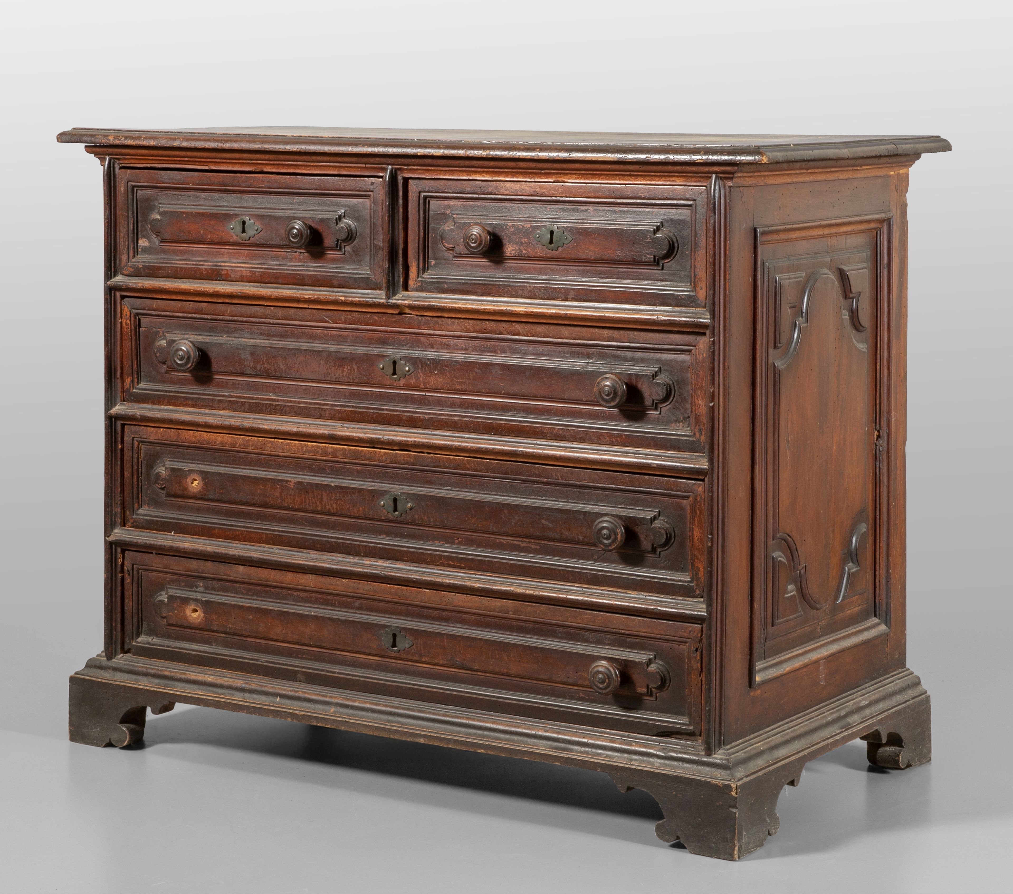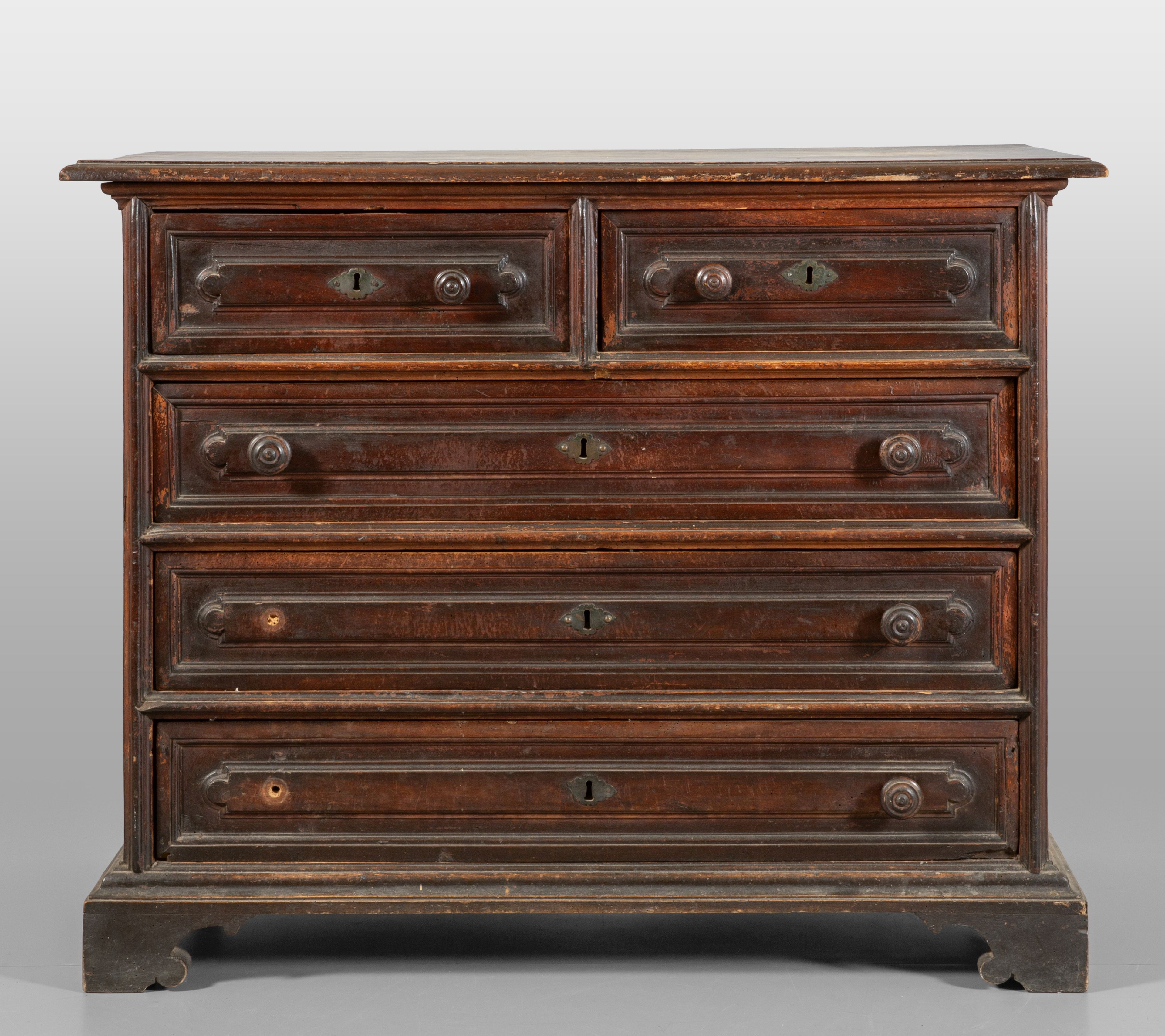 Canterano in noce a patina scura,tre cassetti più due, Genova fine sec. XVII