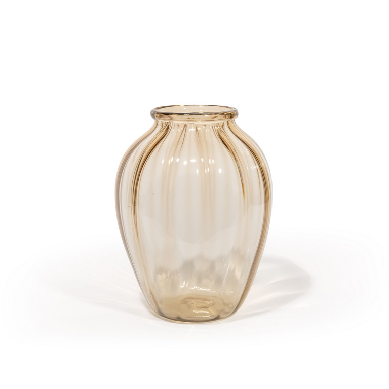 Un vaso in vetro costolato trasparente pagliesco.