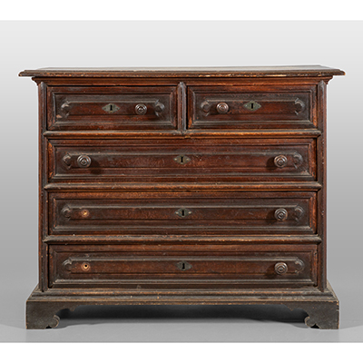 Canterano in noce a patina scura,tre cassetti più due, Genova fine sec. XVII cm. 130x65 h. 98