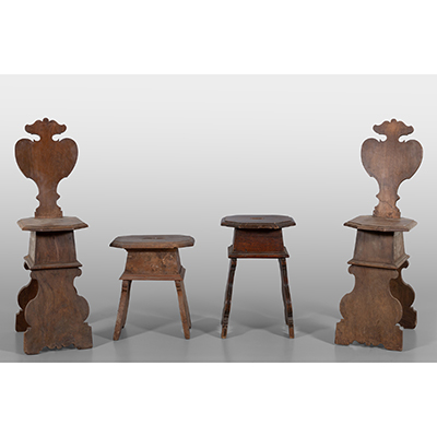 Due sedie e due sgabelli in noce, sec.XIX