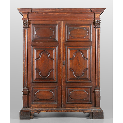 Armadio Luigi XIV in noce a patina scura, porte scolpite a motivi geometrici con capitelli, Genova sec.XVIII cm. 168x83 h.213