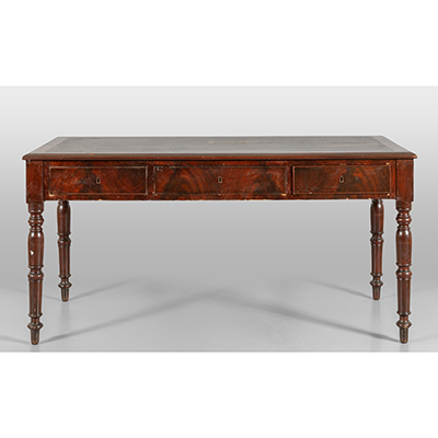 Scrivania da centro lastronata in mogano, un cassetto grande e due più piccoli sul fronte, piano in pelle, sec.XIX cm. 170x78 h. 79