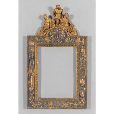 Cornice in legno intagliato, cimasa con personaggi, sec.XIX cm.tot. 44x77, luce cm.31x40