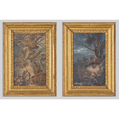 Scuola napoletana sec.XVIII 'Scene classiche' coppia di tempere su carta, cornici in legno intagliato e dorato cm. 26x43