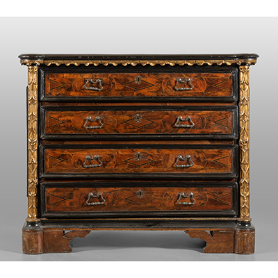 Canterano Luigi XIV lastronato in noce e radica di noce, montanti in legno intagliato e dorato, quattro cassetti, Lombardia I metà sec.XVIII cm. 144x65 h.120