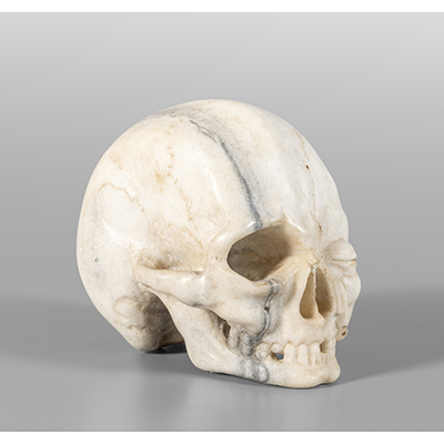 Teschio, scultura in marmo bianco venato, sec.XIX h.cm.18
