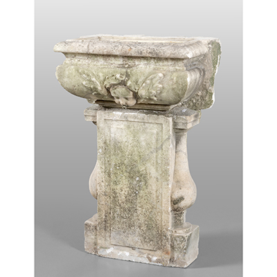 Acquamanile in marmo decorato al centro con figura di un putto con le ali spiegate, sorretto da una base a due colonne affrontantesi, Genova sec.XVII cm. 50x33 h. 83