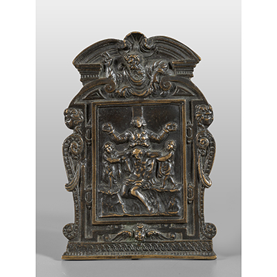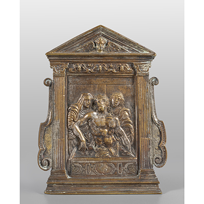Galeazzo Mondella detto il Moderno (sec.XVI), pace ad edicola in bronzo argentato cm. 12x15,5