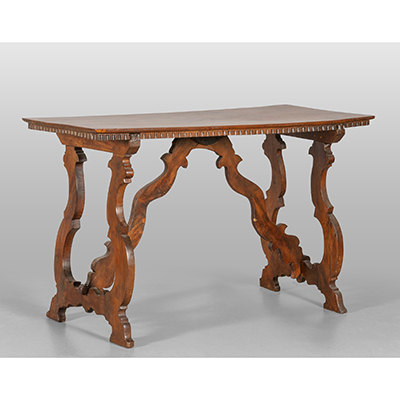 Tavolo a fratina in noce con gambe raccordate da traverse, sec.XIX cm. 58x132 h. 81